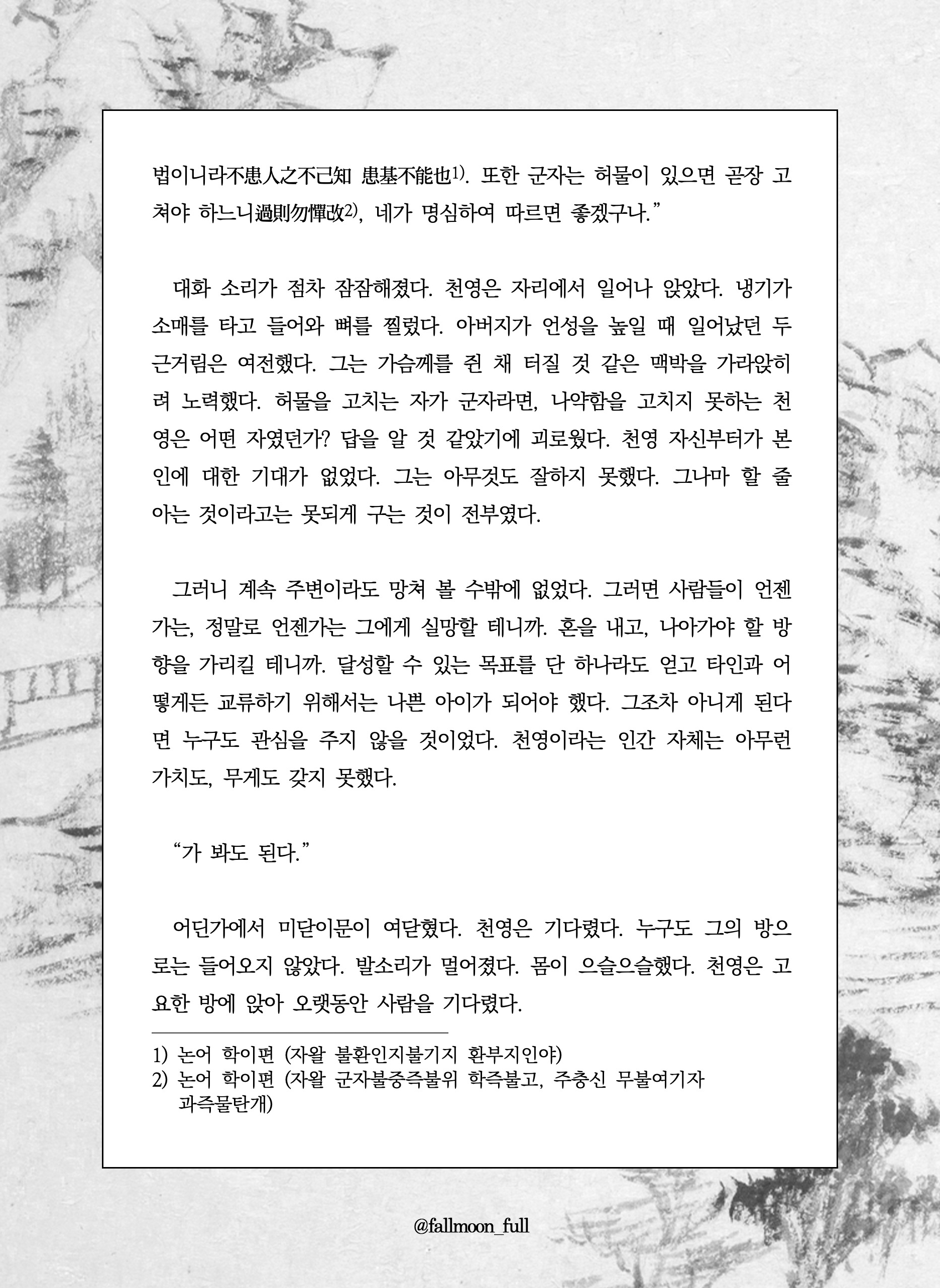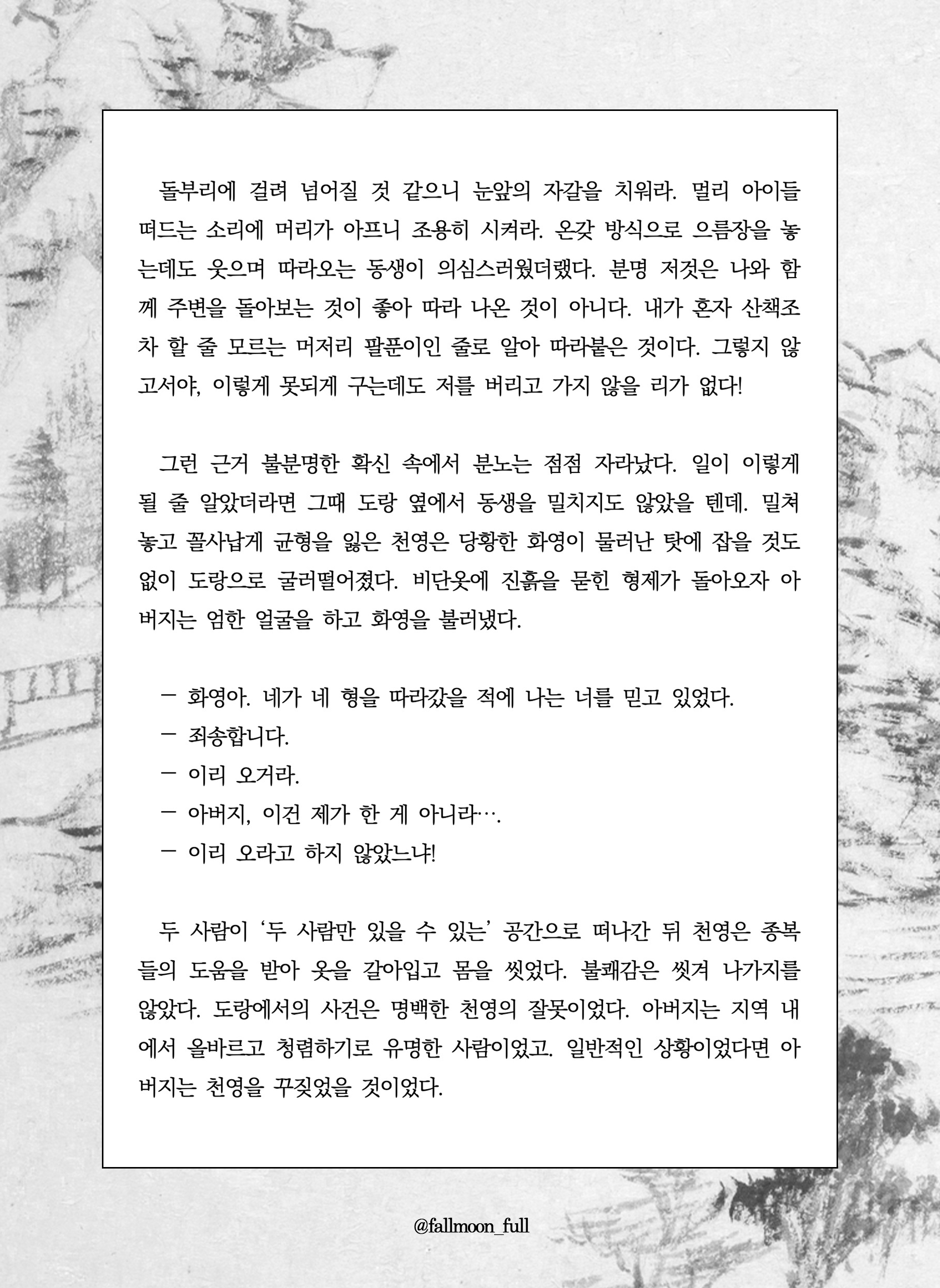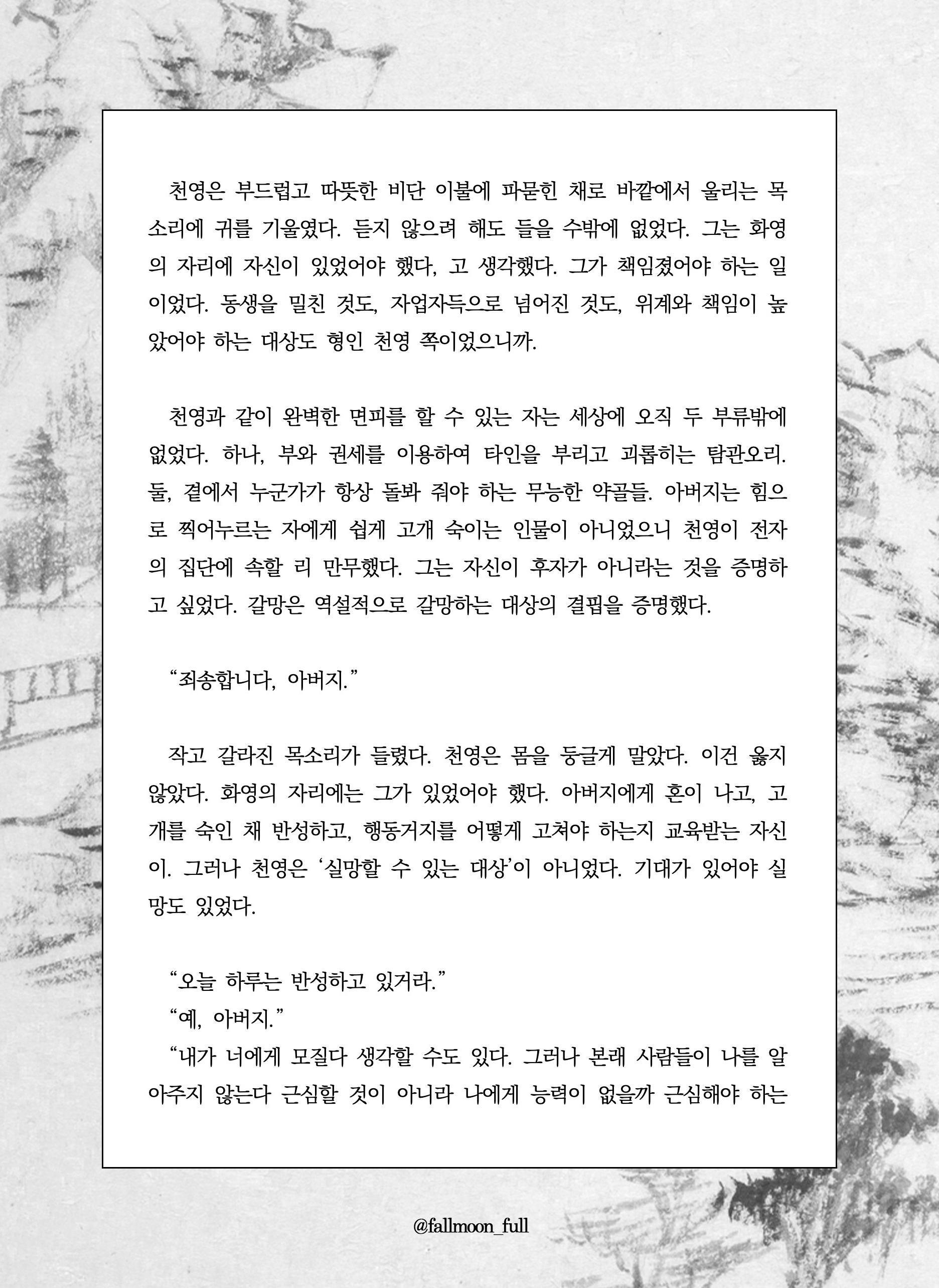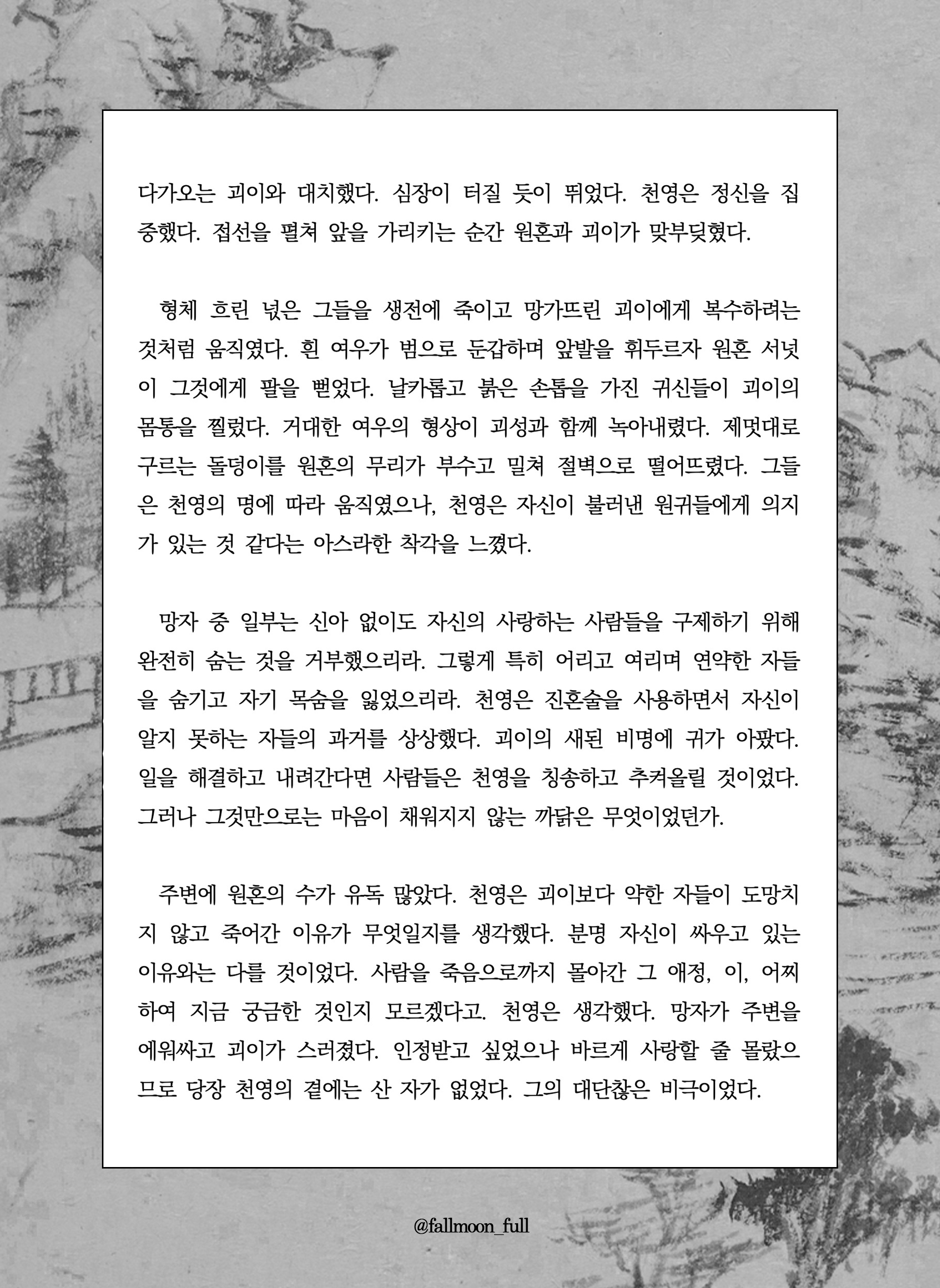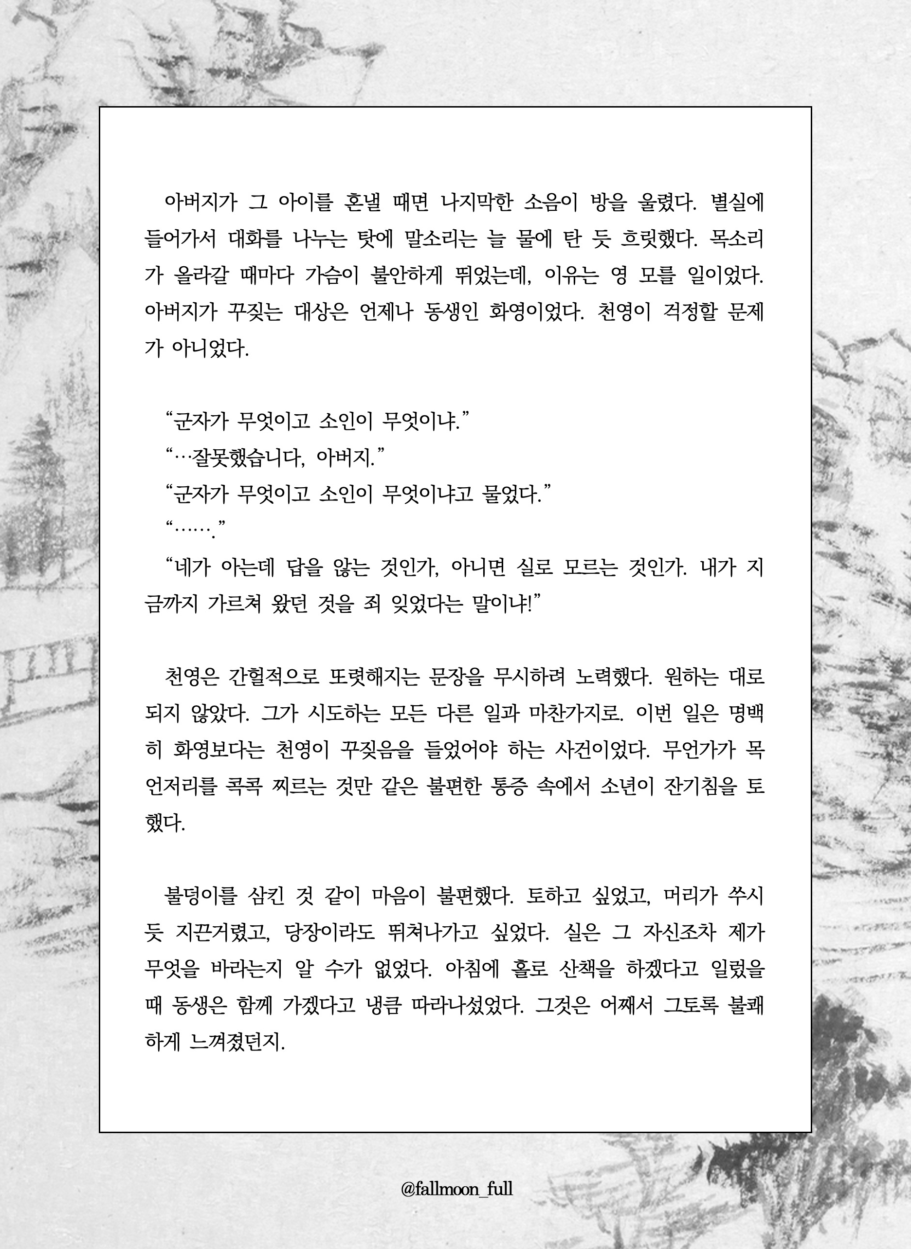 그러나 고통은 경감할 수 있는 것이지 제거할 수 있는 것이 아니라서. 살아 있는 한 영원히 인간은 괴로울 수밖에 없으므로. 몸을 붙인다고 해도 살갗마저 없애지는 못해 영혼과 영혼 사이 장벽이 남기 때문에. 하퍼는 제노에게 기대는 대신 그를 끌어당기면서, 하퍼가 그의 연인을 아는 것과 같이 제노도 저를 알 것이라고 생각했다.