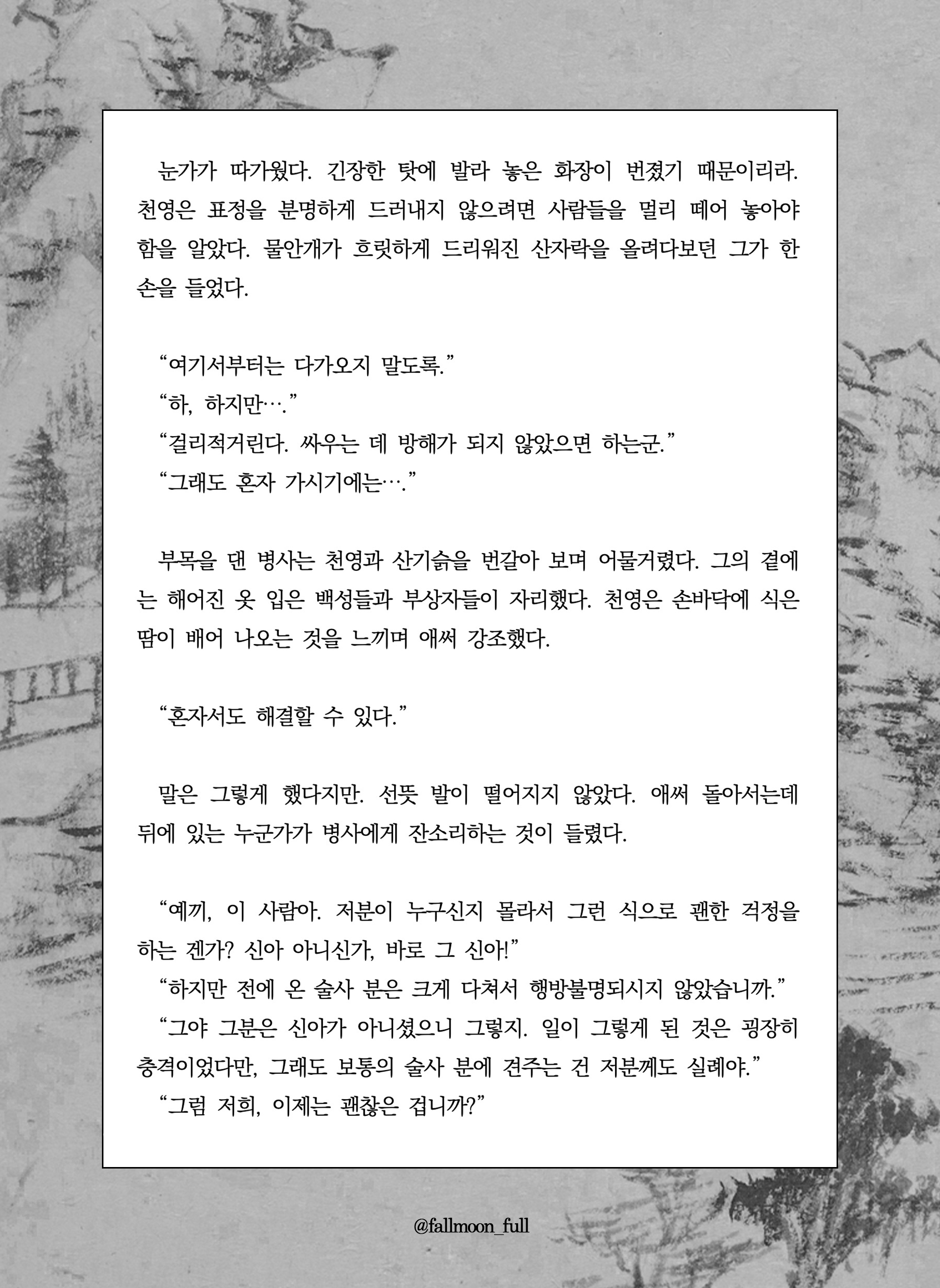 고개를 들었을 때 보이는 남자의 얼굴은 명백히 찜찜해 보이는 기색으로 가득했다. 검은 눈썹은 머지않아 미간에 붙을 것 같았으며 동공은 평소보다도 더 수축한 상태였다. 평소에는 올라가 있는 눈가마저 미묘하게 내려와 있는 그 낯이란. 군인이 되어서 그렇게 뚜렷하게 기분이 드러나는 표정이라니, 상대답긴 했다.